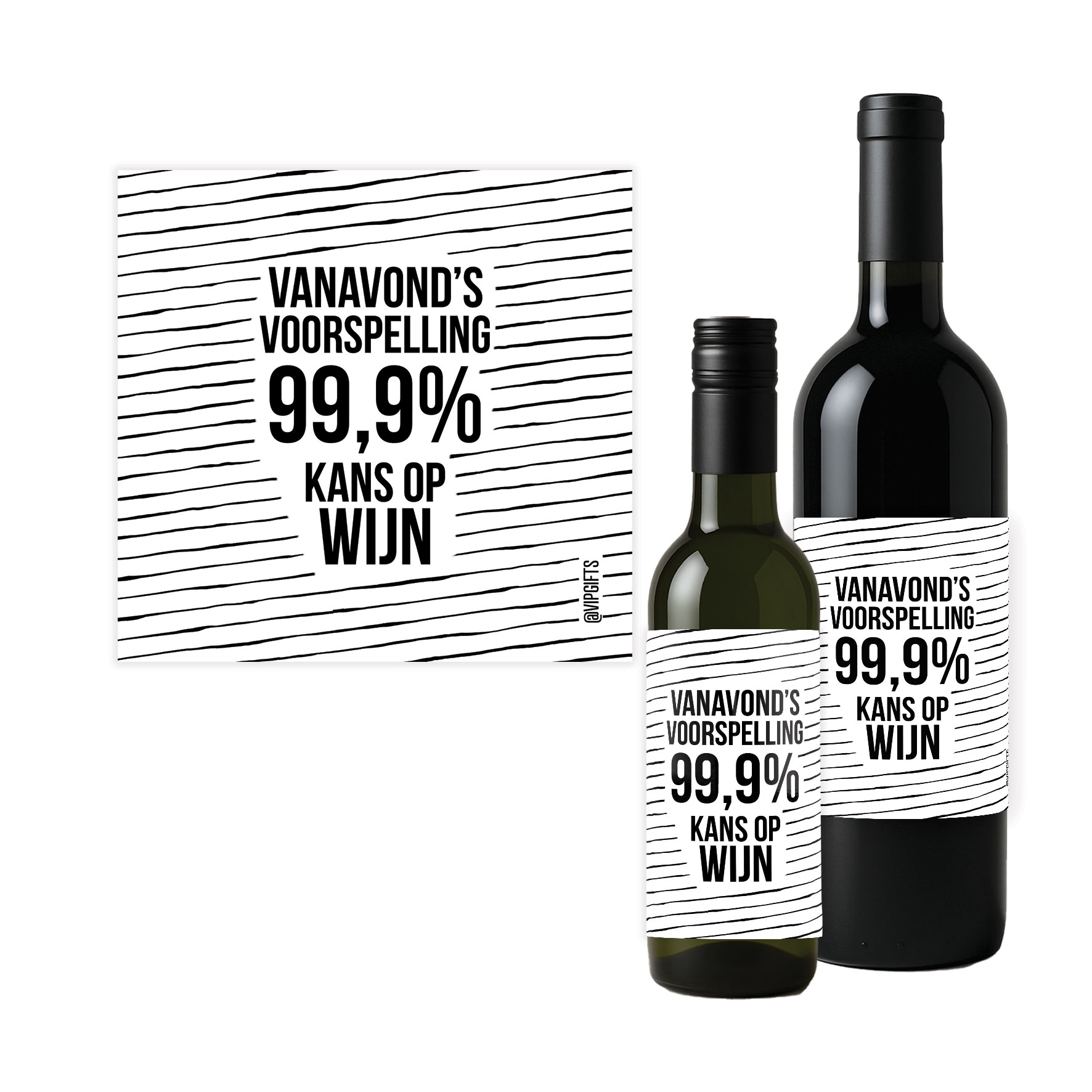 Flesetiket met de tekst: “Vanavond’s voorspelling 99,9% kans op wijn”
