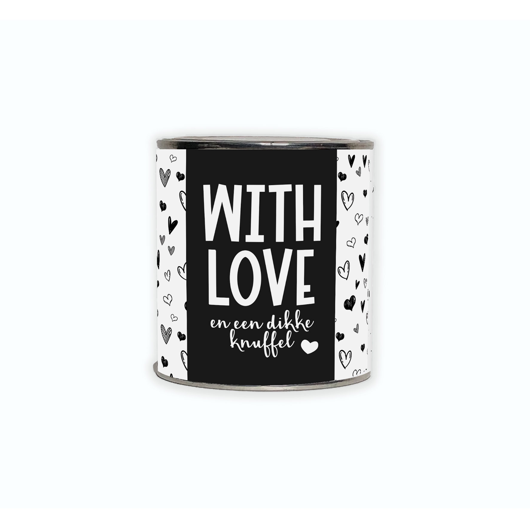 Blikje met de tekst “With Love en een dikke knuffel!”.