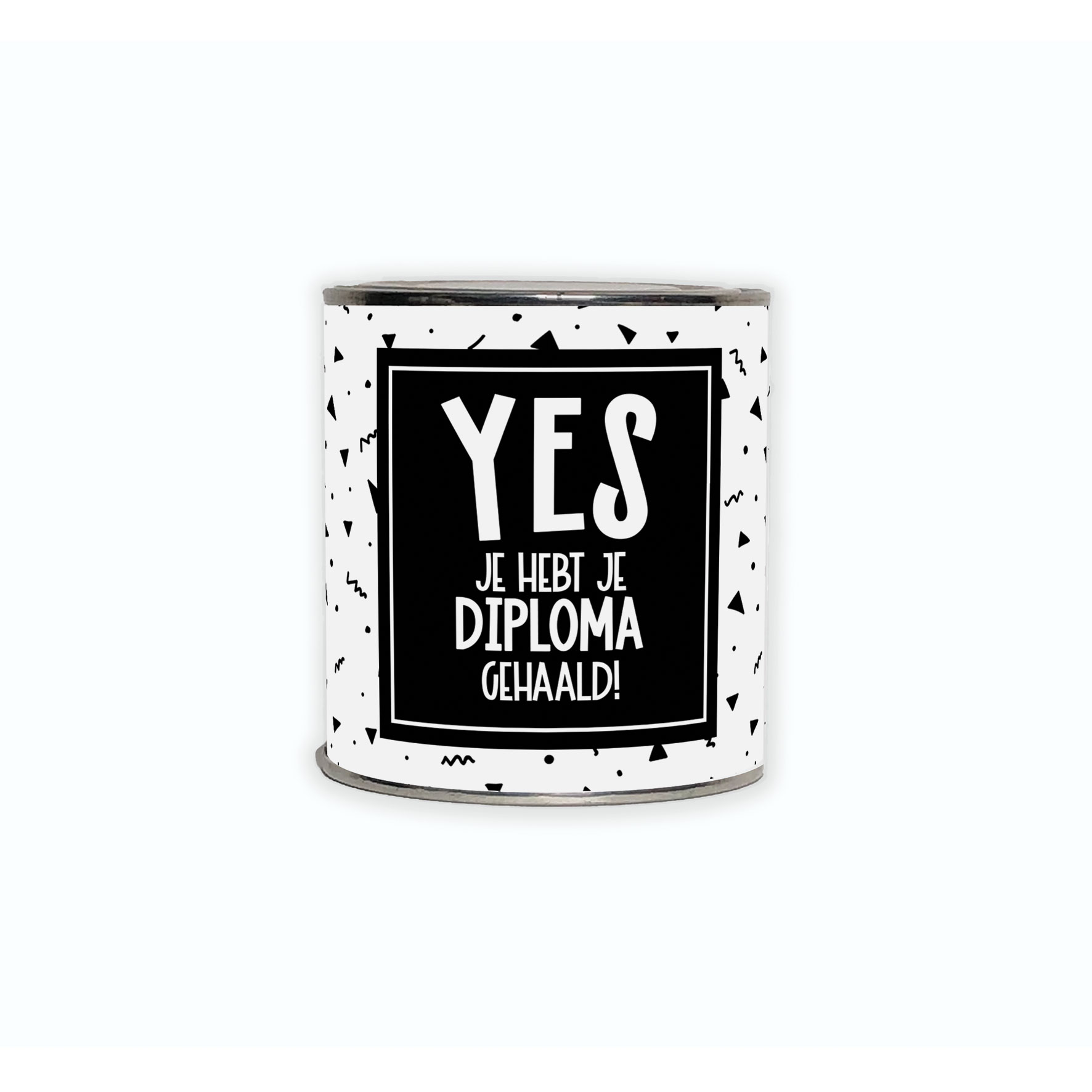 Blikje met de tekst “Yes je hebt je diploma gehaald”.